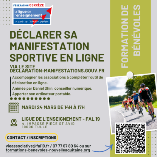 Déclarer sa manifestation sportive en ligne via le site declaration-manifestations.gouv.fr, mardi 24 mars à 14h dans les locaux de la Ligue à TULLE. Inscriptions : https://formations-benevoles-nouvelleaquitaine.org/formation/declarer-sa-manifestation-sportive-en-ligne-via-le-site-declaration-manifestations-gouv-fr/
